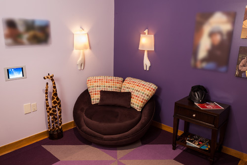 I sofà utilizzati hanno forme ergonomiche ma giocose e colori vivaci.